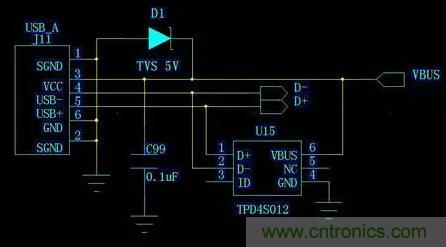 對(duì)外接口的信號(hào)線同樣需要保護(hù),否則靜電經(jīng)過信號(hào)線直接到達(dá)芯片IO管腳,雖然芯片的IO都有二極管保護(hù),一般可以抵御+-2KV的靜電,但是對(duì)于+-6KV的ESD接觸放電,就會(huì)遭遇損壞的風(fēng)險(xiǎn)。同樣是USB接口,如圖2.1,差分信號(hào)線D+和D-接了個(gè)ESD器件TPD4S012,實(shí)際上是與USB電源和地并接反向二極管,把電流導(dǎo)向USB電源或者地。