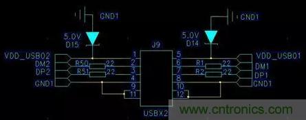 外殼地之間并接5V的TVS管。相當(dāng)于把電源和地鉗位在5V以內(nèi),這樣可以有效地把靜電電流導(dǎo)向地,達(dá)到效果很明顯。要注意的是布局布線的時(shí)候,TVS管要盡量靠近接口的位置,TVS的陰極以最近的路徑接到接口的外殼地(如果有的話)。