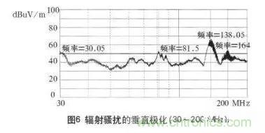 根據對開關電源電磁騷擾源的分析可知,在圖1b電路中高頻變壓器T1也是一個騷擾源。為了阻止高頻變壓器產生的騷擾信號以輻射方式發(fā)射,把變壓器的外殼用屏蔽材料銅箔環(huán)繞一圈構成一回路加以屏蔽,以切斷變壓器通過空間耦合形成的輻射騷擾傳播途徑。并且為了減少因變壓器一次側開通時電流瞬間突變產生的di/dt騷擾,在變壓器T1的一次側串進1個電感,以減小器件的開通損耗,降低輻射騷擾信號。經過整改后,輻射騷擾大大下降,再次對本電源輻射騷擾進行測試,完全達到了標準要求,其測試結果如圖7所示。