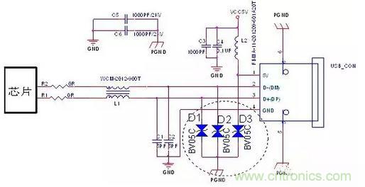 D1、D2、D3選用TVS,TVS反向關(guān)斷電壓為5V。TVS管的結(jié)電容對信號傳輸頻率有一定的影響,usb2.0的TVS結(jié)電容小于5pF;