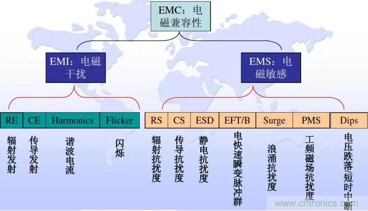 電磁兼容性(EMC)是指設(shè)備或系統(tǒng)在電磁環(huán)境中符合要求運(yùn)行并不對其環(huán)境中的任何設(shè)備產(chǎn)生無法忍受的電磁干擾能力,電磁兼容(EMC)包含電磁干擾(EMI)和電磁抗擾度(EMS)。其包含的測試項(xiàng)目如圖1所示。
