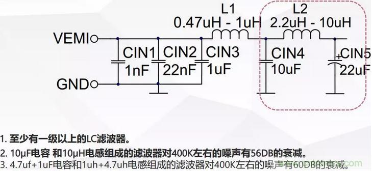所有的LC濾波器都是以電感結(jié)束,并且要遠(yuǎn)離DCDC的高頻環(huán)路。防止電流環(huán)路的近場磁場效應(yīng)對輸入濾波器的影響。