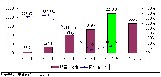 圖1 2004-2008年中國數(shù)字電視機(jī)頂盒市場銷售量及預(yù)測(cè)