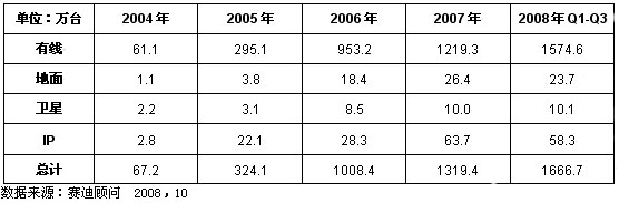 表1 2004-2008年前三季度中國數(shù)字電視機(jī)頂盒銷量產(chǎn)品類型結(jié)構(gòu)變化