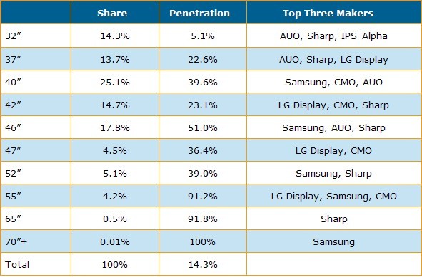 從尺寸別來看第一季雙倍頻液晶電視面板出貨結(jié)果,40寸是最主要的出貨尺寸,出貨量比重達25.1%,46寸以17.8%暫居第二,42寸以14.7%市占率排名第三。而采四倍頻技術(shù)液晶電視面板出貨則集中在40、46與52寸等較大尺寸面板。