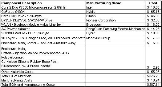 這種新一代Mac Mini的入門級(jí)版本的材料成本是376.20美元,如果計(jì)入制造成本,則總成本升至387.14美元。這種低端型號(hào)的Mac Mini價(jià)格是599美元,這表明與蘋果公司的iPod產(chǎn)品等低成本消費(fèi)產(chǎn)品相比,其個(gè)人電腦的材料成本/制造利潤(rùn)相對(duì)較低。