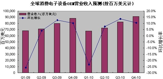 iSuppli公司預測,隨著經(jīng)濟繼續(xù)復蘇,2010年整體消費電子產(chǎn)品營業(yè)收入將增長2%,達到3137億美元。