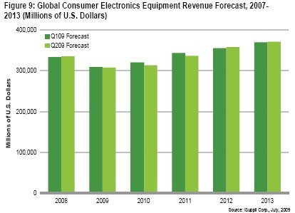 圖9所示為iSuppli對2008年至2013年期間全球消費(fèi)電子設(shè)備營收的預(yù)測。