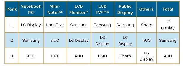 • Samsung奪魁,營收達到42億美元,并占總體TFTLCD出貨營收的27.8%