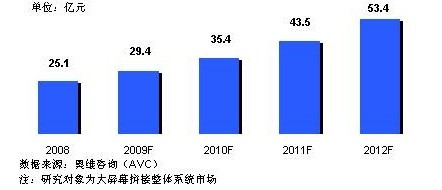 屏幕拼接市場已經進入快速成長期,據奧維咨詢(AVC)《中國大屏幕拼接市場研究報告》顯示,2008年中國市場規(guī)模約為25.1億元,2009年雖然遭遇經濟大環(huán)境的影響,預計仍將增長17%左右,市場規(guī)模將達29.4億元。市場的成長主要得益于國家對能源、交通等基礎建設的大規(guī)模投入,以及09年全運會、10年世博會、亞運會等大型賽會事的拉動。