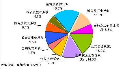 大屏幕拼接產品從最開始較為狹窄的專業(yè)級、高端的應用(如廣電、電力、電信領域等)已經擴展到今日的覆蓋公共管理、民生、能源、工業(yè)、商業(yè)、娛樂等幾十個細分應用領域,只要需要超過100英寸的高品質、持續(xù)工作的顯示畫面的場所,都是大屏幕拼接產品的舞臺。奧維咨詢(AVC)大屏幕拼接研究體系中,依據應用特點將數十個細分領域劃分為10大細分行業(yè),2009年上半年各細分行業(yè)比重結構如下圖: