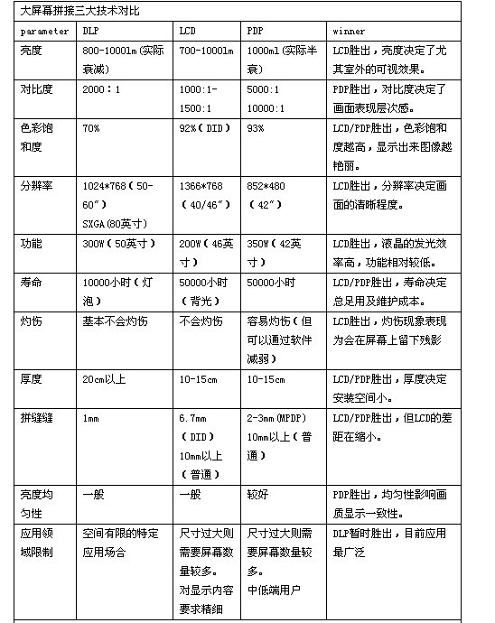 從以下對比表不難發(fā)現(xiàn),從技術層面來看,LCD技術占有綜合優(yōu)勢的地位,主要弱勢是拼接縫較寬,而DLP主要優(yōu)勢則在拼接縫最小,在色彩表現(xiàn)、分辨率、壽命等方面都有著較為明顯的缺陷。PDP則在防灼傷、分辨率方面相對較弱。