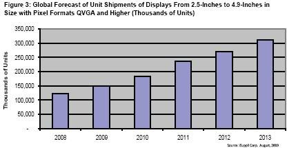 下圖所示為iSuppli公司對對角尺寸介于2.5英寸及4.9英寸之間、像素格式為QVGA及更高的LCD顯示屏全球出貨量的預(yù)測。