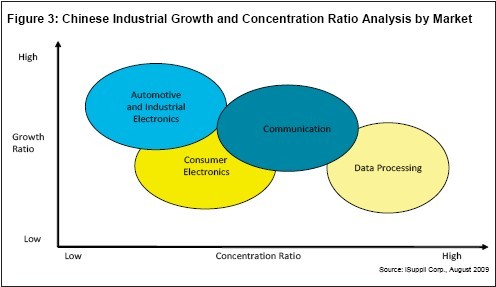 汽車與工業(yè)電子市場(chǎng)具有多樣化與分散化特點(diǎn)。但在中國,未來五年內(nèi),這兩個(gè)領(lǐng)域?qū)⑹撬袘?yīng)用領(lǐng)域中增長最快的。工業(yè)高速增長和制造業(yè)集約化程度低,為分銷商提供了許多商業(yè)機(jī)會(huì)。圖3所示為iSuppli公司對(duì)中國工業(yè)增長與集中程度的分析,按市場(chǎng)細(xì)分。