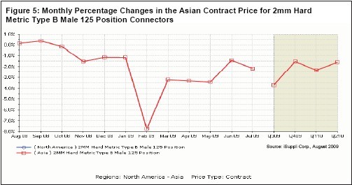 iSuppli公司認(rèn)為,第二季度訂單比第一季度增長(zhǎng)15-16%,出貨量增長(zhǎng)7-9%。這種趨勢(shì)與其它商品市場(chǎng)一致。但是,連接器領(lǐng)域補(bǔ)充庫(kù)存的勢(shì)頭不太強(qiáng)。圖5所示為亞洲每月連接器合同價(jià)格的百分比變動(dòng)率,以代表市場(chǎng)趨勢(shì)的未來(lái)四個(gè)季度預(yù)測(cè)。