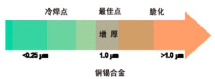 更高溫度和與被焊接部件更長時間的接觸也可能增加金屬化合物的結(jié)合層。從而不建議延長接觸時間和重復(fù)返工。上圖表顯示了隨著結(jié)合層的厚度增加,脆化現(xiàn)象發(fā)生的機率就更大。[page]