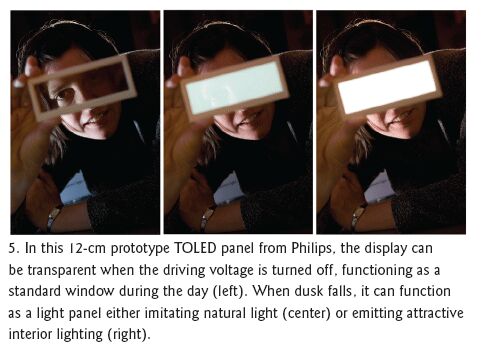 當TOLED加電時,它允許光線從兩個方向穿過。該特性對頭頂顯示器、光隔柵(白天幾乎看不見了,夜晚則是舒適的漫散光)、氣氛照明、光幕幔、用于導航和預警系統(tǒng)的汽車擋風玻璃以及建筑物的窗戶等應用很有用。開發(fā)TOLED的公司包括:歐司朗光電半導體、飛利浦和UDC。原型TOLED預計將在一兩年內(nèi)問世。
