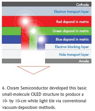成員之一的歐司朗半導體公司去年展示了一款10×10cm的OLED面板,它在1000cd/m2條件下,具有30至50lm/W的光輸出,壽命為5000小時。在歐司朗這一工作的中間環(huán)節(jié),還證明了OLED的白光輸出能比以前取得的較低水平有提高。歐司朗采用的是基本的真空沉積技術,使用的是小分子而不是可打印聚合物(圖6)。歸功于與BASF AG的合作,該面板的光輸出后增至60lms/W。