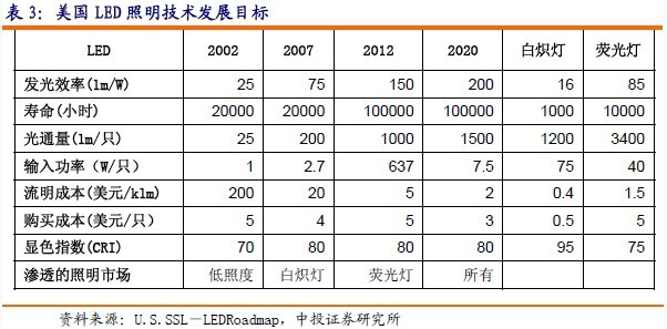 LED照明在2007年開始滲透進(jìn)入白熾燈照明市場、2012年進(jìn)入熒光燈照明市場,而大量取代白熾燈和熒光燈將分別在2012年和2020年。