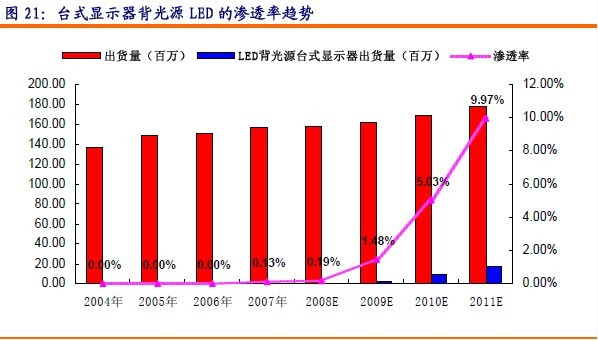 預(yù)計臺式顯示器的出貨量將從2007年的156.6百萬臺增長到2011年的177.5百萬臺,其中采用LED背光源的臺式顯示器將從2007年的0.2百萬臺增長到2011年的17.7百萬臺左右,滲透率從2007年的0.1%上升到2011年的10%左右。其中每臺顯示器用lLED數(shù)量為60個左右。