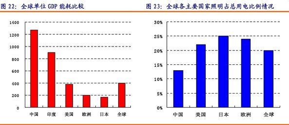 中國政府也已經(jīng)開始實現(xiàn)照明節(jié)能計劃,目標(biāo)是到2010年每年降低能耗10%。在目前的照明用電占整個用電的比例中,可以看出中國照明用電比例低于全球主要經(jīng)濟(jì)發(fā)達(dá)國家,也低于全球的平均水平,說明工業(yè)用電比例較高,從而使得單位GDP所消耗的能源明顯高于全球平均水平。