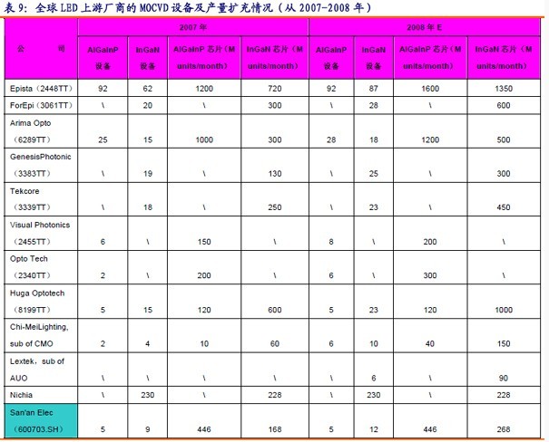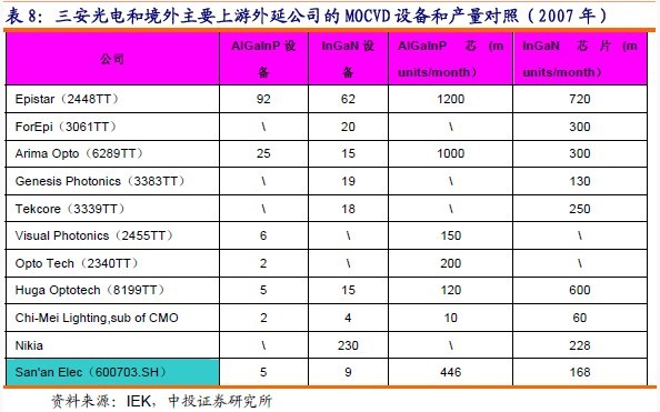 我們以截止2007年底為止,對三安光電和臺灣上游外延廠商的MOCVD設(shè)備及外延片、芯片產(chǎn)能進(jìn)行比較。