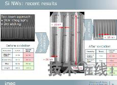 目前,IMEC正在嘗試試制適于太陽能電池的硅納米線。要實現1.7~1.8eV的帶隙,硅納米線的直徑需要降至2~4nm。為形成這種極細的硅納米線,IMEC采用了為制造新一代半導體而開發(fā)的EUV曝光。