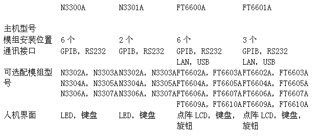 費(fèi)思FT6600A和安捷倫N3300A各有兩款主機(jī),分別最大可支持6個(gè)模組和3個(gè)模組;具體如下: