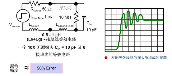 探頭接地引線實(shí)質(zhì)可以等效為電感效應(yīng),接地引線電感與探頭及示波器的輸入電容形成串聯(lián)諧振電路。而探頭的輸入電阻則在諧振電路中引入阻尼。電感效應(yīng)會(huì)造成阻抗不匹配,而且是帶寬越大影響就越大。等效電感的大小與接地線長度有關(guān),其越長電感效應(yīng)就越大,對波形的破壞效應(yīng)就是會(huì)產(chǎn)生脈沖信號的振蕩、過沖等信號完整性問題帶有接地引線電感的示波器探頭等效電路及效應(yīng)如下圖4。