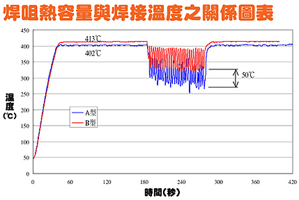 答案是B型。由于B型焊咀比A型咀焊粗(銅的部份),所以B型比A型的熱容量也較大和導(dǎo)熱性較快。雖然兩支焊咀形狀一樣(尖端部份),但B型咀身比較粗,焊咀越粗,銅的部份越大,保持溫度穩(wěn)定的能力也越大。(請(qǐng)參考以下圖表)