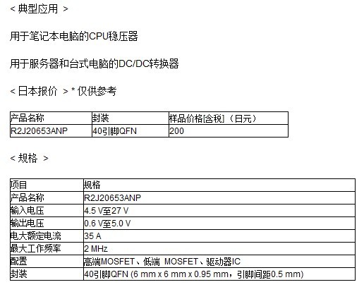 長期以來,瑞薩一直在提供符合DrMOS標(biāo)準(zhǔn)的一系列產(chǎn)品,尤其是輸出電壓為12V的服務(wù)器和臺(tái)式電腦。新的R2J20653ANP將可承載的輸入電壓擴(kuò)展到適用于筆記本電腦的20V適配器電壓,成為瑞薩高電壓容限電源類的首款產(chǎn)品。這款產(chǎn)品的推出有助于筆記本用CPU電源在實(shí)現(xiàn)更加小型化的同時(shí),達(dá)到更高的性能,并且有望帶動(dòng)DrMOS標(biāo)準(zhǔn)更加廣泛的應(yīng)用。