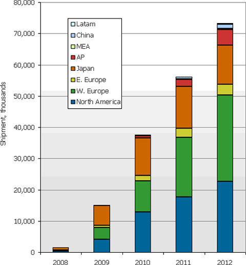 - 3D TV將由2009年的20萬(wàn)臺(tái)成長(zhǎng)到2018年的640萬(wàn)臺(tái)