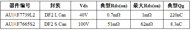 采用新款大罐式封裝的 AUIRF7739L2 具有業(yè)內(nèi)最低的導(dǎo)通電阻,在給定 PCB 區(qū)域 40V 電壓時的導(dǎo)通電阻典型值僅為 0.7mΩ 。此外,與 D2PAK 相比,大罐式封裝的占位面積可以減少60%,厚度可以降低85%。這款器件可提供卓越的功率密度和效率,非常適合高負(fù)載電機控制應(yīng)用,包括電動助力轉(zhuǎn)向系統(tǒng) (EPS) 和微型混合動力車的電池開關(guān)和集成式起動發(fā)電機 (ISA) ,以及底盤、傳動系統(tǒng)和動力系統(tǒng)等。