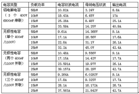 第三個替換試驗是用薄膜電容器替代660V交流輸入電壓變頻器中的鋁電解電容器。由于手頭沒有660V感應(yīng)電機(jī),負(fù)載只能采用電阻箱替代感應(yīng)電機(jī)。其測試結(jié)果列于表3。