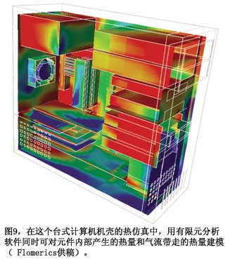 美國國家半導(dǎo)體的Webench在線設(shè)計(jì)工具采用Flomerics的Flotherm熱分析軟件,計(jì)算靜止空氣中的器件溫度。所有一般的仿真注意事項(xiàng)均適用。如果你的電路有風(fēng)扇和一些氣流,其溫升就較低。如果有機(jī)箱,里面還有其它器件,其溫升就高。Flomerics采用有限元方案技術(shù)(參考文獻(xiàn)5)。圖9顯示了一個計(jì)算機(jī)機(jī)殼發(fā)熱與氣流的分析結(jié)果。很多其它有限元解算器也可以分析這種問題。例如,Comsol的一個解算器可以完成多重物理分析,可以解算超過一個問題的偏微分方程,如一只部件的熱響應(yīng),部件的導(dǎo)熱性能隨其溫度而變化。TI的Edwards指出,他的公司提供二種級別的熱建模抽象:ΦJB熱阻,以及Delphi緊湊模型標(biāo)準(zhǔn)。Flotherm、Icepak和很多其它熱分析程序都使用這些模型。