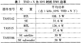 TexasInstruments還提供具有數(shù)字增益控制功能的RMS功率測量方式,使THD+N≤10%。利用TI公司的TAS5508或TAS5086型調(diào)制器,可以實(shí)現(xiàn)數(shù)字增益。THD+N為10%時(shí)的平均功率要高于正常FTC的THD+N<1%時(shí)的額定功率。表2列出了THD+N為10%時(shí)的平均功率。
