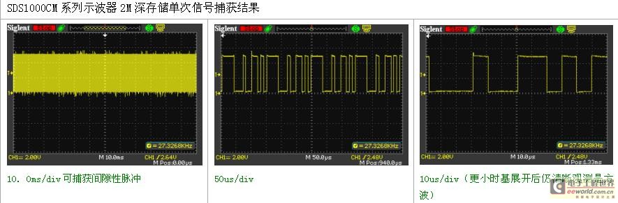 由此看來,在存儲深度一定的情況下,采樣率越高,采樣時間就越短。隨著信號的日益復雜,想要完整地呈現信號的全貌或是信號間的相對關系,單憑高采樣率無法實現,還需要長時間的采樣捕捉獲得較長的信號。傳統(tǒng)示波器,在此需求下,采樣率和采樣時間本身是矛盾的,既需要高采樣,又需要長采樣時間,在存儲深度一定且不大的情況下,是根本無法實現。經過創(chuàng)新性設計的SDS1000CM系列數字示波器,擁有同級別產品中最大的2Mpts存儲深度,完美地調和這兩者的矛盾。提高示波器的存儲深度可以間接提高示波器的采樣率。以一臺采樣率為1Gsa/s、存儲深度為20K的示波器為例來說,只要水平掃描速度在20ns/div以上時基,采樣速度就會急速下降。因為當需要測量較長時間的信號波形時,必然要求大的時基檔位,這就造成采樣率的下降,采樣率的下降可能會遺漏信號的細節(jié)勢必造成信號波形質量的下降。這時候就需要大的存儲深度來維持更高的采樣率來采樣測量。長存儲在保證獲取不失真的波形的同時又可以觀察更長時間的信號。