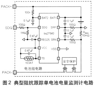 阻抗跟蹤鋰離子單節(jié)電池組電路如圖2所示。通過BAT2引腳輸入端測量電池電壓,通過庫侖計數(shù)器差動信號輸入端(SRP及SRN)監(jiān)測電流。系統(tǒng)利用電量監(jiān)測計從單線SDQ通信端口獲得SOC及運(yùn)行時間接近結(jié)束(Run-Time-to-Empty)等信息。