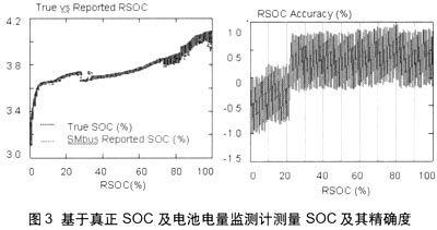 即使在負(fù)載變化的情況下,IT電量監(jiān)測計也能正確預(yù)測電池的剩余電量。例如,數(shù)碼相機(jī)處于不同工作模式時,電池的負(fù)載也不同。圖3顯示了IT電量監(jiān)測計如何精確預(yù)測電池剩余電量。剩余電量預(yù)測的誤差率可小于1%。并且,由于用以預(yù)測剩余電量的電池阻抗及老化作用能夠得到實(shí)時更新,故在電池整個使用壽命內(nèi)均可保持這種微小誤差。