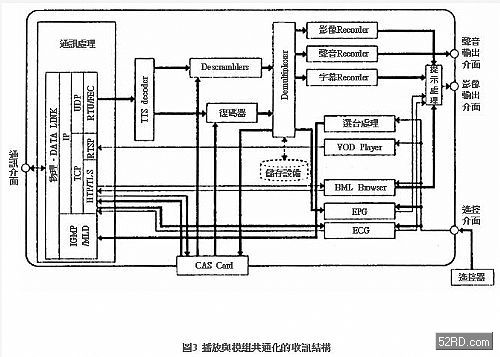 上述整合技術(shù)透過(guò)終端的共通化,可以實(shí)現(xiàn)系統(tǒng)的經(jīng)濟(jì)化要求。圖3是播放與模組共通化的收訊機(jī)結(jié)構(gòu)范例;圖4是支援次世代IPTV的數(shù)字電視機(jī)的實(shí)際外觀,它不需要傳統(tǒng)STB就能夠提供IPTV服務(wù)。