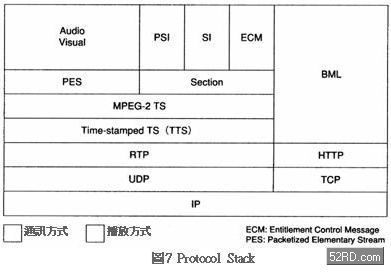 表1是次世代IP電視播放方式的諸元,該方式以標(biāo)準(zhǔn)數(shù)字播放為平臺(tái),同時(shí)追加以IP網(wǎng)路傳送數(shù)字播放節(jié)目的內(nèi)容。圖7是IP播放方式的ProtocolStack,如圖所示該P(yáng)rotocolStack與數(shù)位播放一樣,可以利用TS(TransportStream)使多重化Stream收容在Multicast內(nèi)。