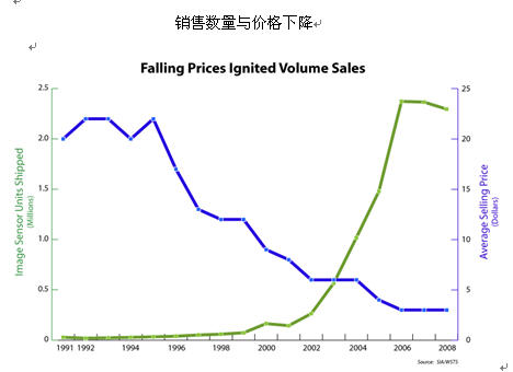 半導體在新應用中增加滲透最有趣的例子是隨著市場應用的銷售額增加,而芯片的價格卻不斷下降。如數碼相機,其中使用的半導體主要是非揮發(fā)存儲器,圖像傳感器 。在1990年代初期,固態(tài)圖像傳感器的售價為20-25美元,直到最近10年,圖像傳感器的總市場銷售額,仍是很小,幾乎可忽略不計。在2000年代圖像傳感器的價格己從20-25美元下降到5美元。在這價格范圍時,由于使用數量急速上升,使得在過去幾年中圖像傳感器的TAM達到半導體總銷售額的3%以上。在此同時,NAND閃存價格每年下降65%, 主要是市場需求數量成正比增加。其結果是數碼相機的銷售額及其使用的半導體持續(xù)的增長。