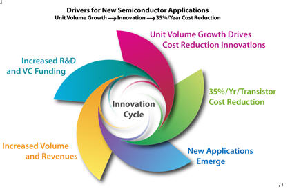 在新的應用和市場增長推動下,此種模式在半導體業(yè)中一次又一次的重復, 即應用數量的增長推動了半導體芯片價格的下降。應用市場的擴大又推動銷售額增大,進而為發(fā)展新技術提供資金, 進一步促進成本的下降, 又能增加新的應用市場誕生。如在數碼相機情況下, 低成本的固態(tài)圖像傳感器及存儲介質推動其銷售量的上升, 同樣能在數字攝像, 安全系統(tǒng), 醫(yī)療中圖像處理, 汽車中及其它許多場合中得到大量的應用。因此, 半導體TAM的增長不僅是因為晶體管的價格每年下降35%, 而是由于許多新的應用市場的推廣共同促成。