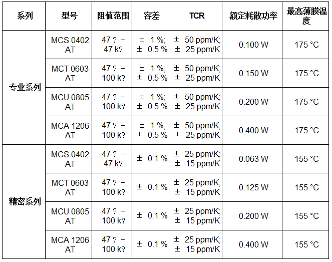 精密系列具有低至±15ppm/K的TCR和±0.1%的容差,兩個系列電阻的阻值范圍擴(kuò)展至47Ω。