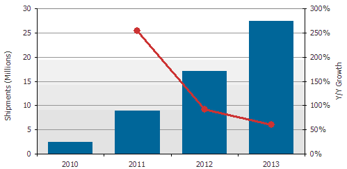 隨著主要電視品牌廠商開始在商場銷售3D電視及有愈來愈多關(guān)于3D產(chǎn)品計劃的進(jìn)行,DisplaySearch將2010年3D電視出貨量提高到250萬臺,同時3年后3D電視市場將會有非常驚人的發(fā)展,預(yù)估到2013年將超過2千7百萬臺出貨。圖一為2010到2013年間3D電視出貨量預(yù)測。