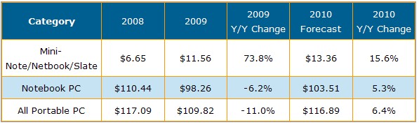 展望2010年筆記本電腦市場,出貨量將有強(qiáng)勁增長同時(shí)銷售價(jià)格降幅趨于緩和,使得便攜式電腦市場的營業(yè)額能達(dá)到1千170億美金,恢復(fù)到2008年的水平。上網(wǎng)本與平板電腦將是營收增長最高應(yīng)用別,主要是由于高單價(jià)產(chǎn)品的推出;不過上網(wǎng)本平均銷售價(jià)格將由2009年每臺400美元下滑到每臺300美元;而Apple iPad將是該應(yīng)用別主要出貨貢獻(xiàn),平均單價(jià)從入門機(jī)種每臺499美金到高階機(jī)種超過每臺800美金之上都有。
