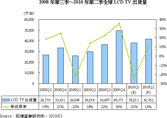 每年第一季歐美地區(qū)普遍缺乏節(jié)日刺激銷售,因此當季全球LCD TV出貨量往往呈現(xiàn)衰退狀況。雖然業(yè)界期望中國春節(jié)能改變第一季衰退的命運,但2010年春節(jié)中國市場LCD TV銷售量僅214萬臺,遠低于各界預估的400萬臺。拓墣產(chǎn)業(yè)研究所張乘維經(jīng)理估計,2010年全球LCD TV首季出貨量僅3,802萬臺,較2009年第四季下滑23%。