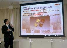 面向新聞媒體的發(fā)布會。三洋半導(dǎo)體的吉村充弘(高端器件事業(yè)部小型器件開發(fā)部課長)介紹了此次的產(chǎn)品。攝影:Tech-On!。投影顯示的是三洋半導(dǎo)體的數(shù)據(jù)。上部的大尺寸封裝為EFC4615R,下部的小尺寸封裝為EFC4612