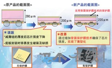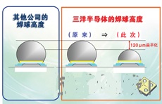 后者的封裝采用了兩項扁平化技術(shù)。一是改變了焊錫球的形狀。從原來的球狀改為了半球狀,高度降低了120μm。第二項是封裝背面的保護膜技術(shù)。將Si部分的高度比原產(chǎn)品降低80μm,并為確保強度而在背面粘貼了20μm的保護膜。這減少了60μm的高度。兩項技術(shù)加起來,此次將高度從已有的EFC4601R的550μm降低了33%至370μm。