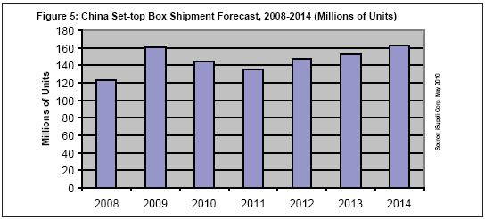 2009年中國總體機頂盒出貨量達(dá)到1.605億臺,比2008年的1.234億大增30%。iSuppli公司的圖表顯示,這些數(shù)據(jù)證明中國已成為全球最大的機頂盒生產(chǎn)國,以及領(lǐng)先的機頂盒設(shè)計中心。